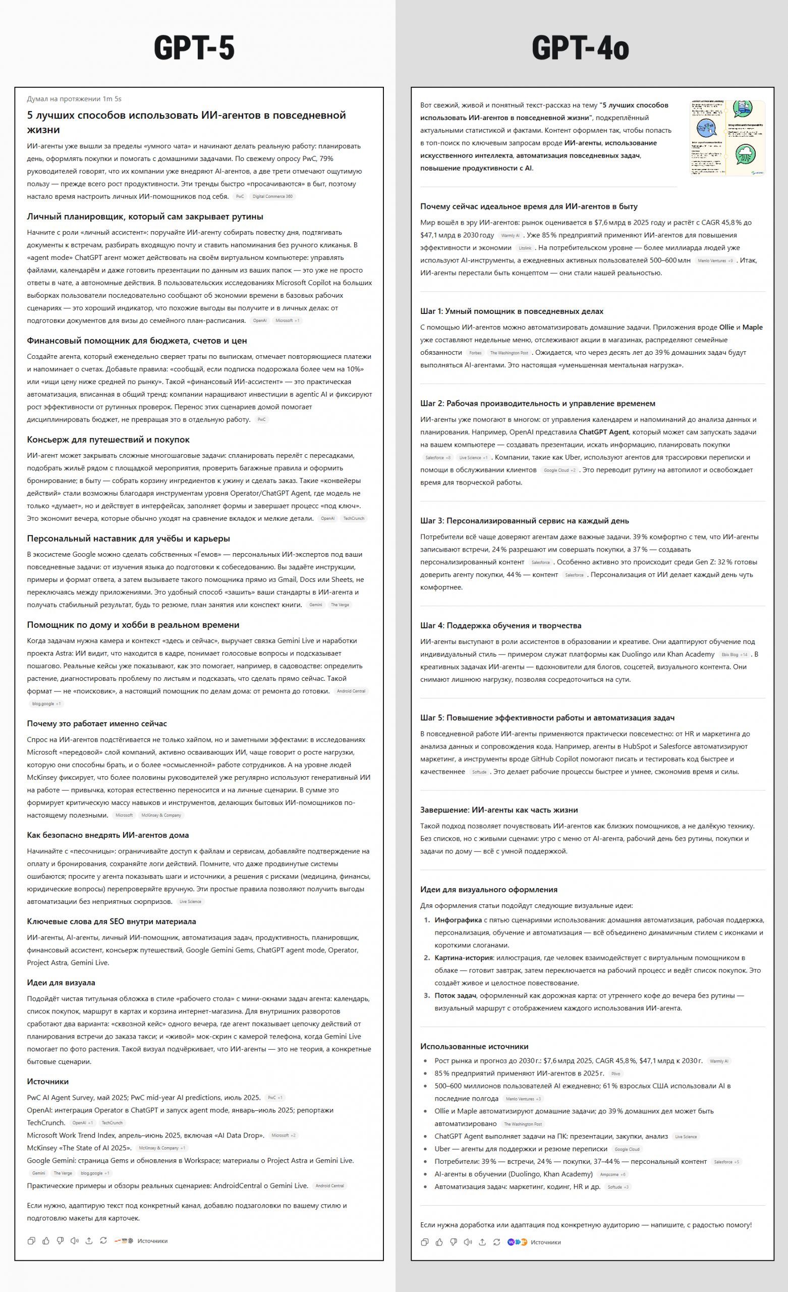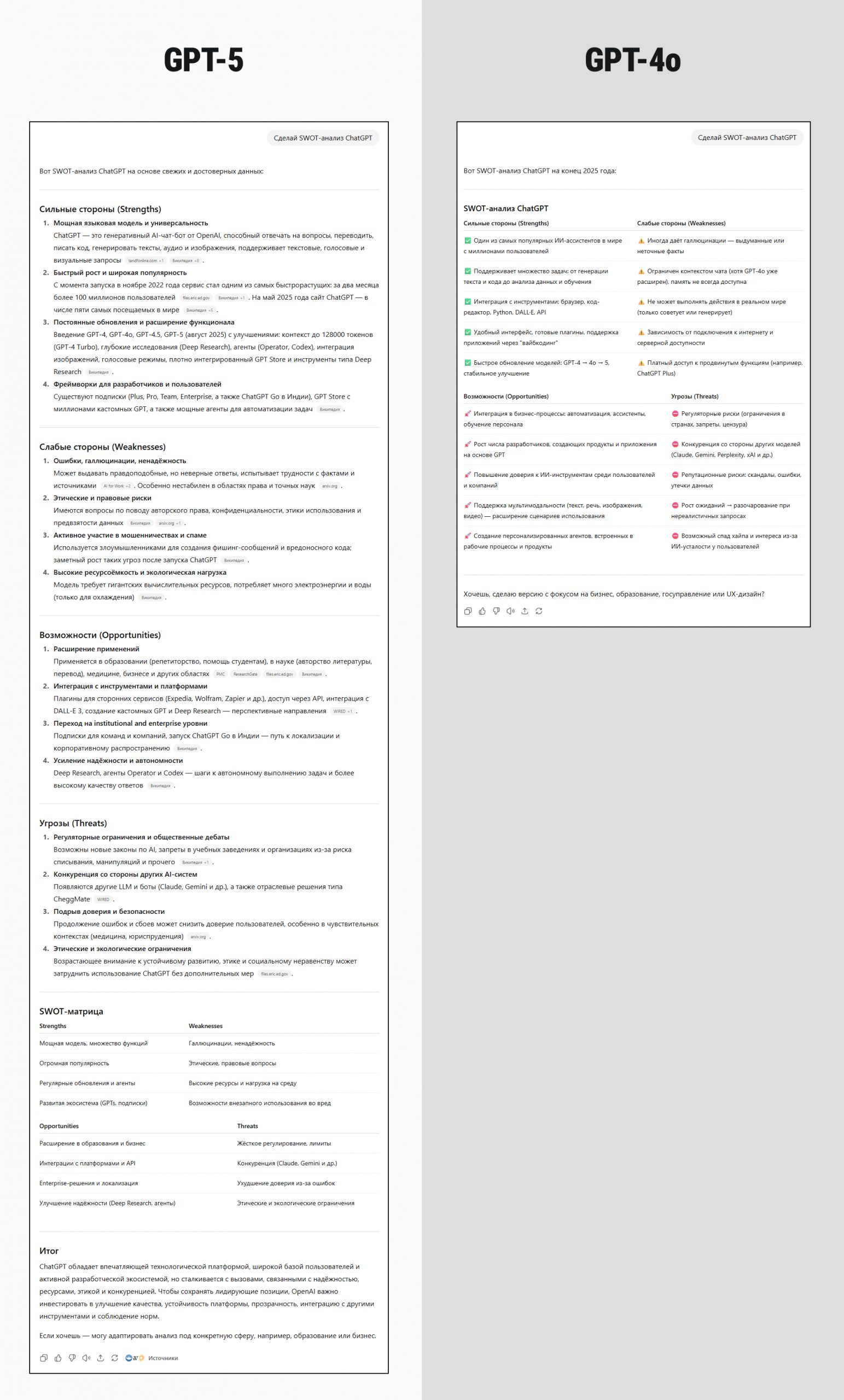 GPT-5 собирает больше данных, подключает свежие источники и выдает развёрнутый анализ. У GPT-4o отчёты сухие и шаблонные.
