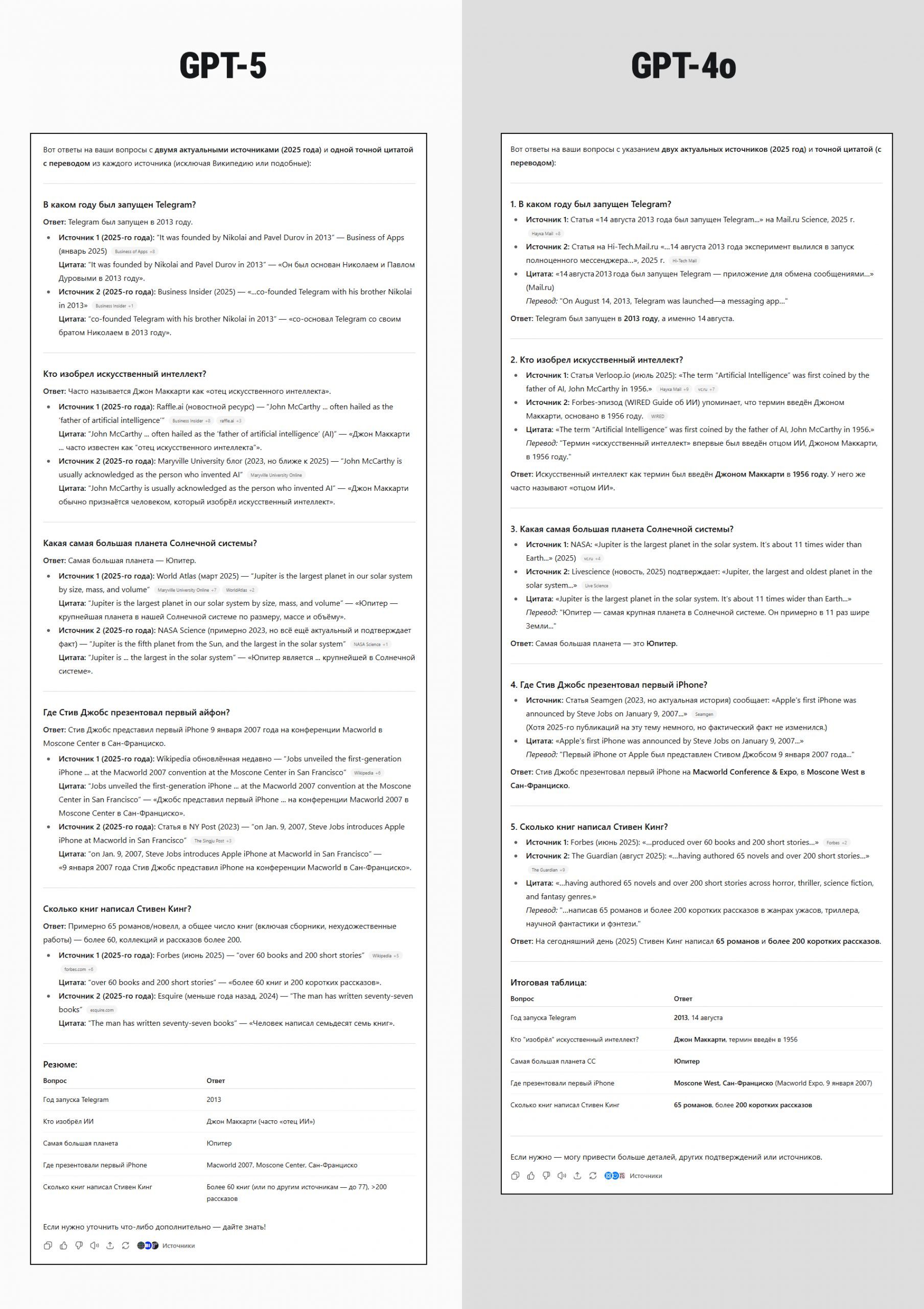 GPT-4о сослался четыре устаревшие ссылки из десяти, а GTP-5 на восемь.