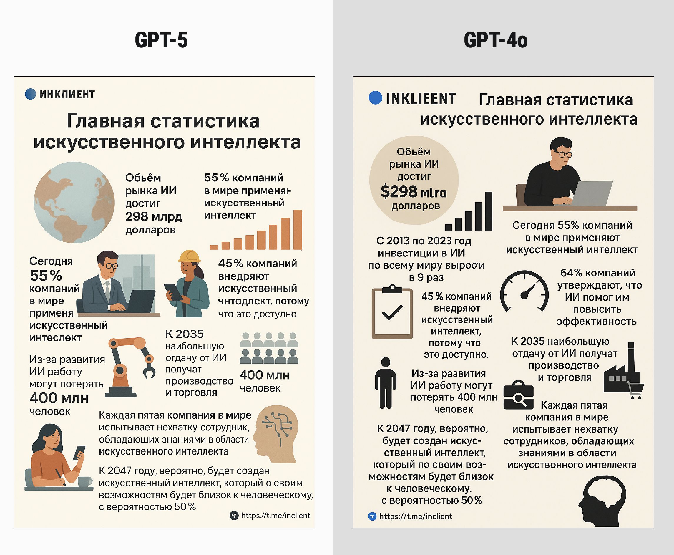 При простых запросах выигрывает GPT-4o — четкий текст, меньше багов. В задачах где много текста (например, инфографика) GPT-5 создает визуал чище и продуманнее.