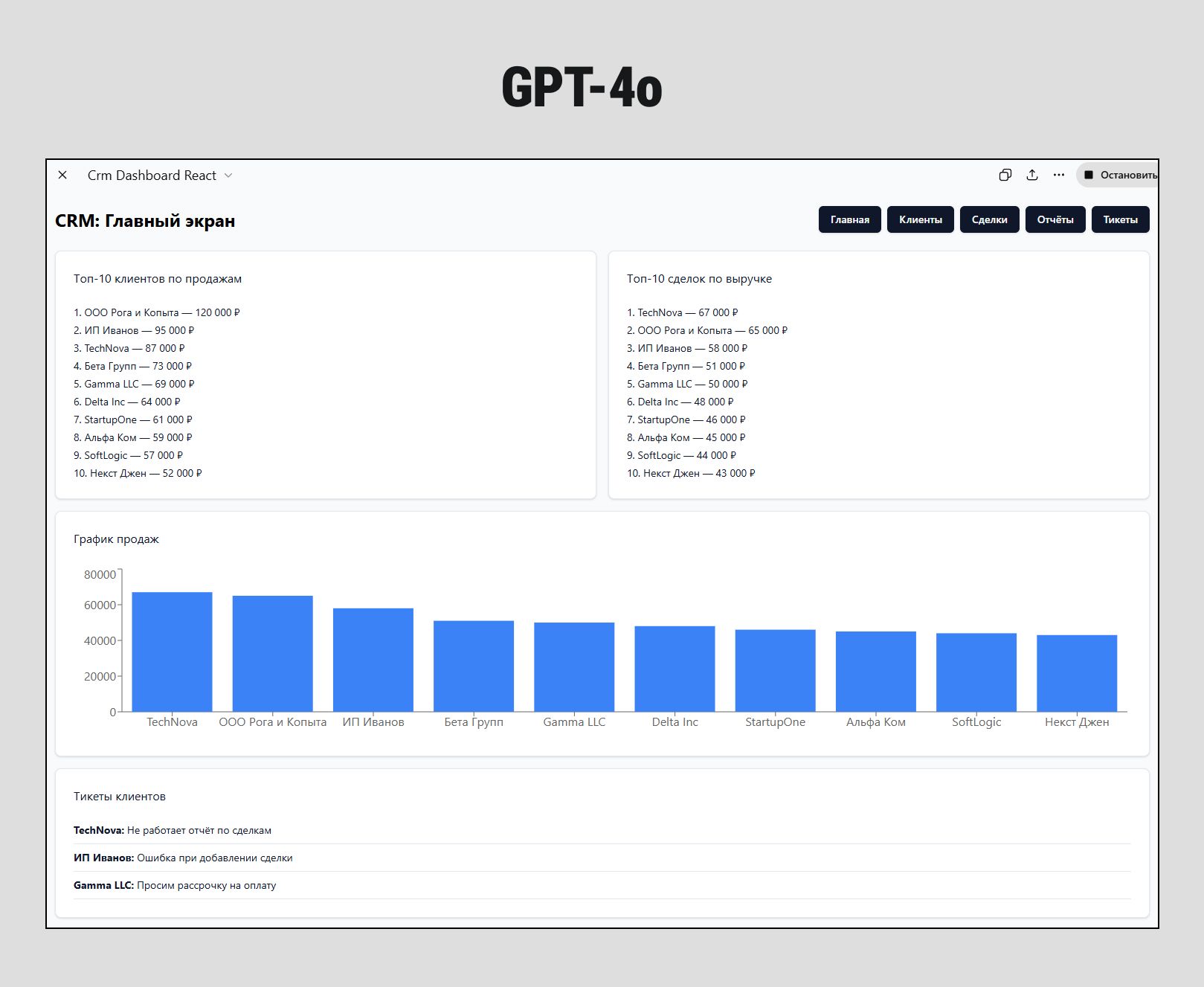 Создай главный экран CRM-приложения. Используй React. В интерфейсе должны быть экраны: топ-10 клиентов по продажам, топ-10 сделок по выручке, график продаж, тикеты клиентов. Добавь необходимые кнопки и меню, а также логику к ним. Заполни экран демо-сделками и клиентами, чтобы удобно было смотреть. Сделай минималистичный UI-интерфейс с легкой цветовой палитрой.
