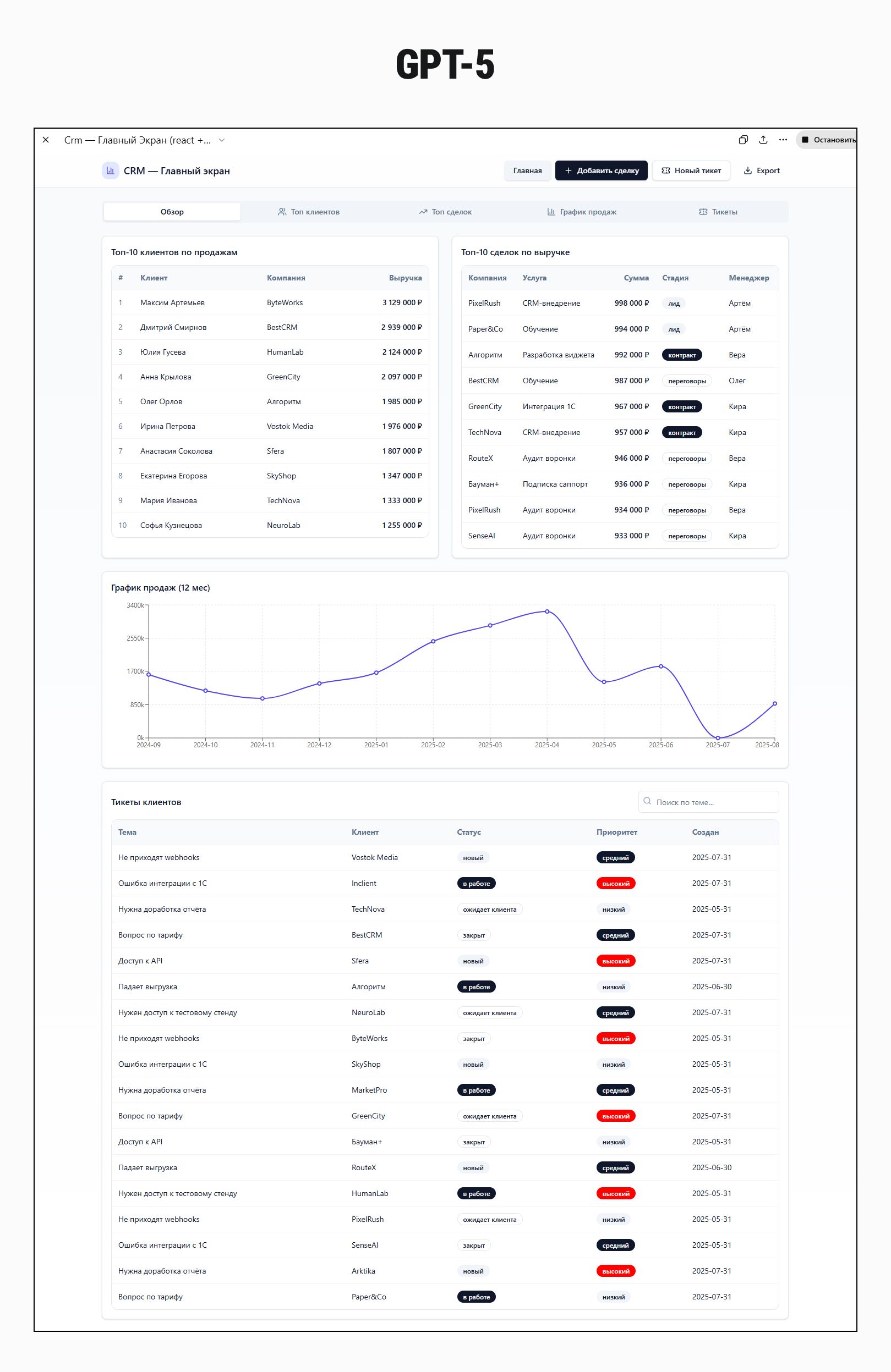 GPT-5 предусмотрел ховеры, жирный текст, подобрал сочетающиеся легкие цвета, информация в экранах не перегружена.