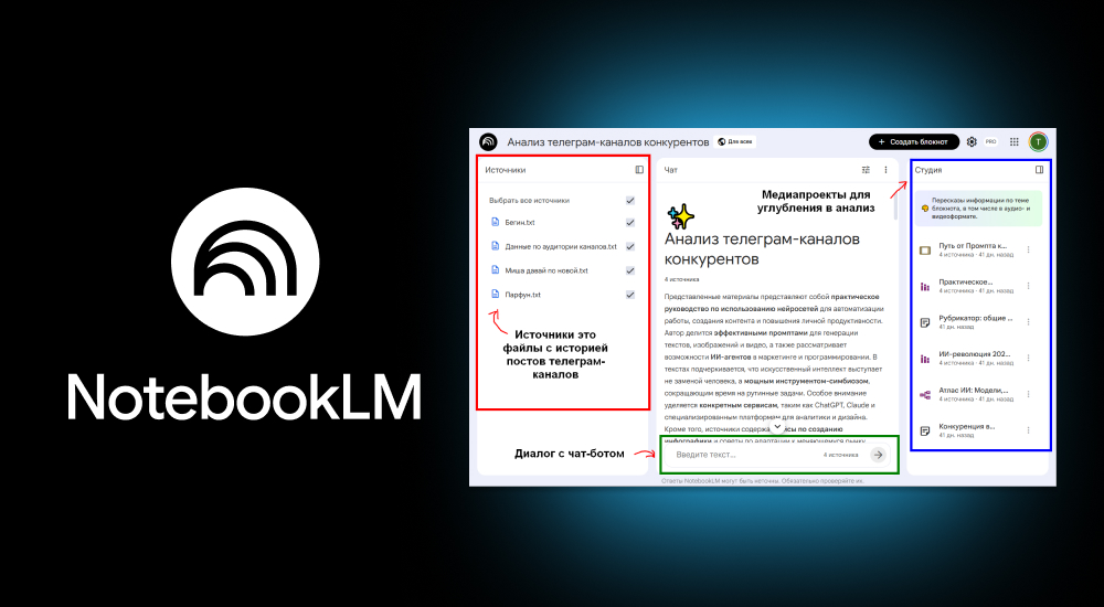 В отличие от обычных чат-ботов, NotebookLM работает строго с источниками пользователя: PDF, тексты, ссылки на статьи/видео, гугловские документы и т.д. Минимум глюков, больше полезных ответов. Кроме того, эта нейросеть переваривает гигантский объем данных, в один источник можно загрузить две с половиной «Войны и мира» (лимит в 500 тысяч слов), поэтому, для анализа контента телеграм-канала это один из лучших бесплатных инструментов на рынке.
