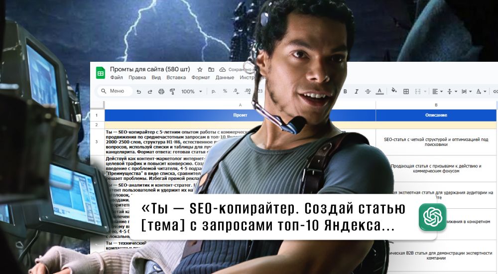 Промты для создания тайтлов и мета-описаний веб-страниц. Это могут быть статьи, целевые страницы, витрина товаров, фотогалерея, справка и так далее.